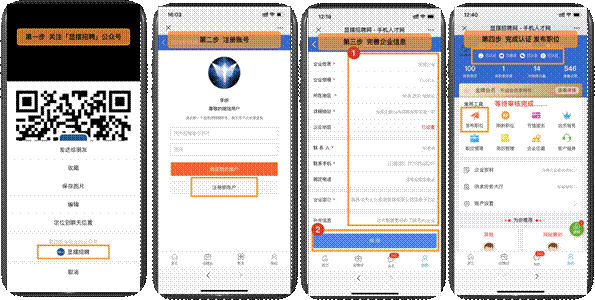 移动端:微信识别右侧二维码关注进入公众号,点击右下角【显摆招聘会【登录/注册】点击微信图标注册新账户完成账号注册选择【我是招聘者】