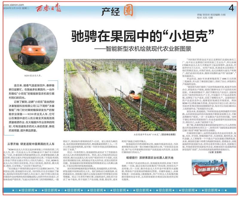 “企业得到了沣西新城人才引进支持、英才创业项目补贴等多重政策支持,不到一年时间,团队便完成M200农业无人车的设计、研发和生产。目前,M200农业无人车已在国内十余个省份交付使用,并远销韩国、北美等海外市场。”西安沐秦智能科技有限公司总经理张旭超表示,企业将始终秉持以用户为中心,务实创新的核心理念,致力于向全球用户提供高效、智能、绿色的农业解决方案,为农业向绿色智能可持续发展转变贡献力量。