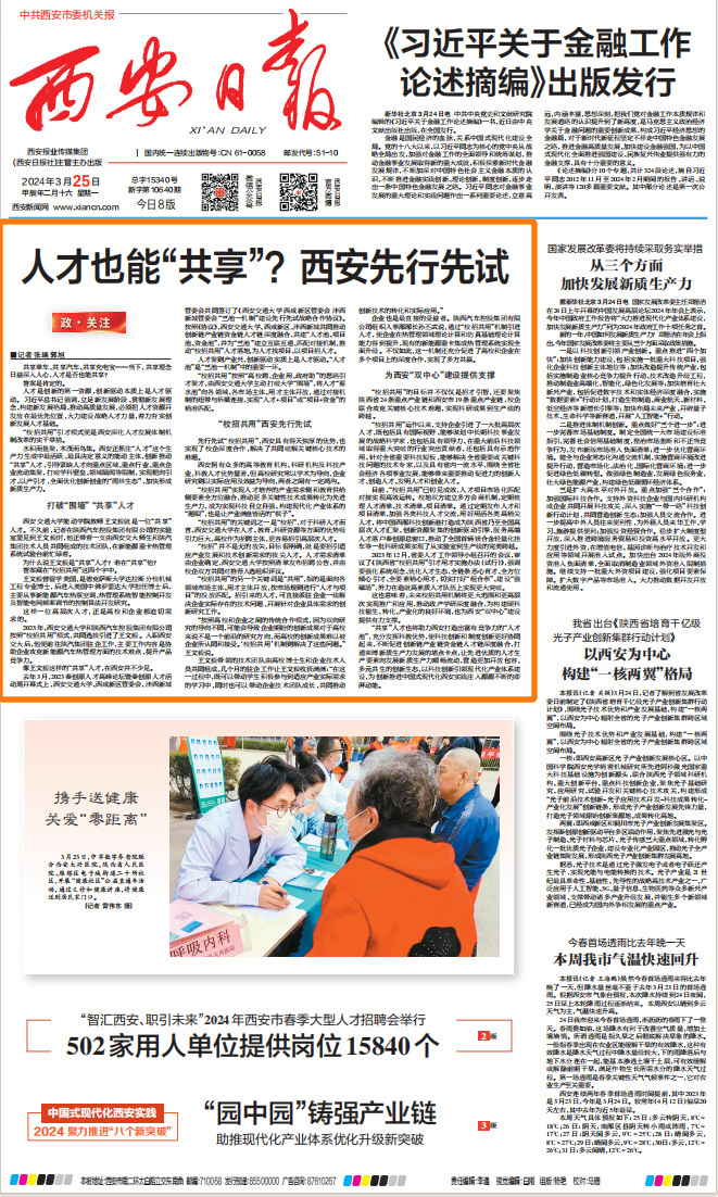 3月25日,《西安日报》头版头条刊发《人才也能“共享” 西安先行先试》聚焦西咸新区,通过校招共用“三池一机制”建设搭建良好的创新创业生态,全文如下。