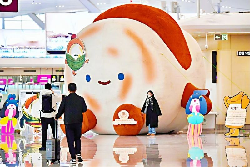 进入候机大厅,恢弘的气势扑面而来。陕西特色的“绒馍馍”和“秦岭四宝”等IP形象随处可见,展现了浓厚的本土文化氛围。中央广场的LED大屏滚动播放着陕西的历史文化与旅游景点,让旅客沉浸式感受三秦大地的魅力。
