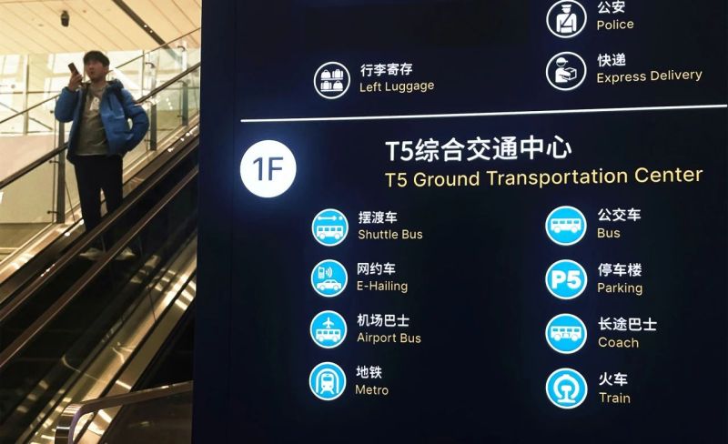 T5航站楼的东侧是35万平方米的综合交通中心,集城际铁路、地铁、巴士等多种交通方式于一体,与航站楼室内多层连接。交通中心内引入了3条地铁线、2条城际/高铁线,以及各类公路交通,旅客换乘距离最远不超过300米,实现了航空、地铁、城际、公路交通之间的快速衔接。