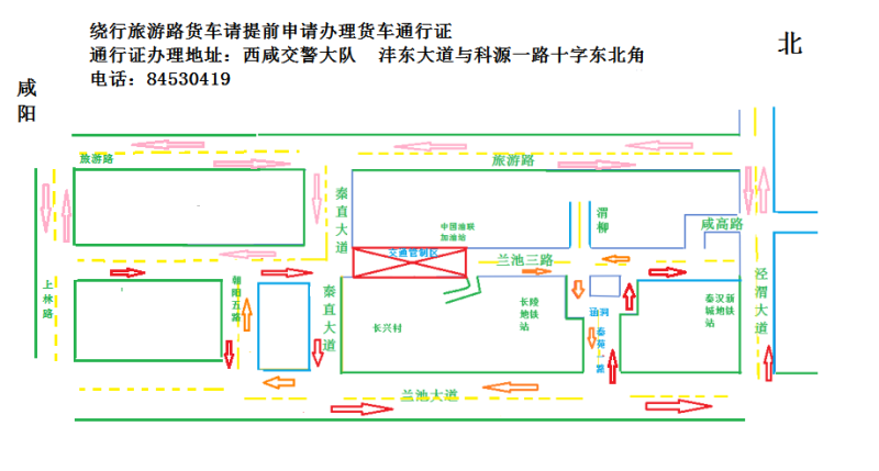 (2)货车绕行路线:沿兰池三路前往咸阳方向车辆,请通过泾渭大道、旅游路、秦直大道绕行;沿咸阳前往秦汉新城方向车辆,请通过上林路、旅游路、泾渭大道绕行。