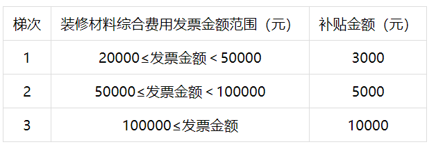 1.以消费者与装修企业签订的装修合同为依据,按照装修合同中装修材料综合费用发票金额(含材料费及施工费用)对应梯次,分档给予补贴,最高补贴10000元。