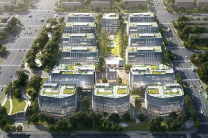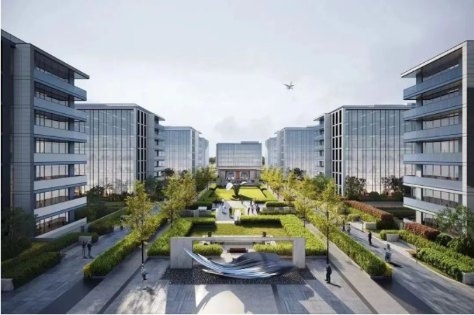 作为办公区域的南区,则以“天”为概念,采用圆弧、曲线作为建筑设计元素,追求“活泼、自由、开放”的设计理念,5栋单体延续北区南北中轴线为对称轴,北部布置2栋单体,南部布置3栋单体。目前,5栋办公楼正处于基础施工阶段。