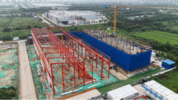 项目共包括2栋生产厂房、1栋综合楼、1栋配套楼及停车楼。目前,1号楼基础施工已完成;2号楼一层主体完成80%,二层主体完成40%;3号停车楼正在进行基础混凝土施工工作;4号楼主体1-4层已完成,五层完成80%;5号楼主体结构已封顶,屋面工程完成80%。
