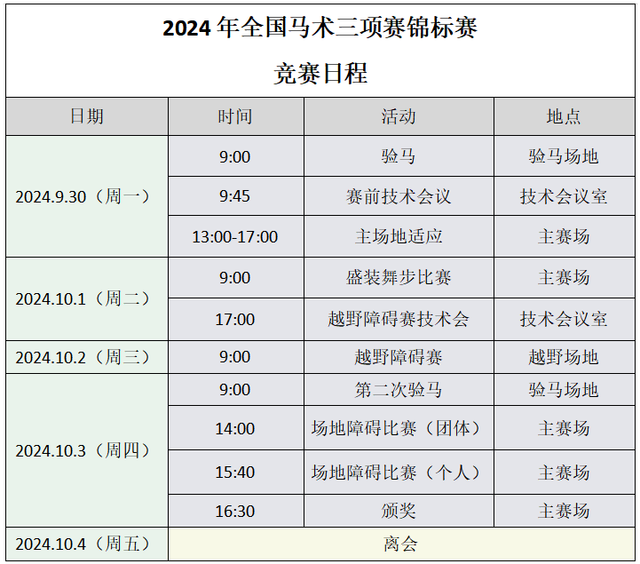 2、比赛分三天举行,第一天进行盛装舞步,第二天进行越野赛,第三天进行场地障碍。盛装舞步比赛使用二星级比赛科目(B表),越野赛和场地障碍赛的技术要求按国际马联竞赛规则规定的二星级比赛要求执行。
