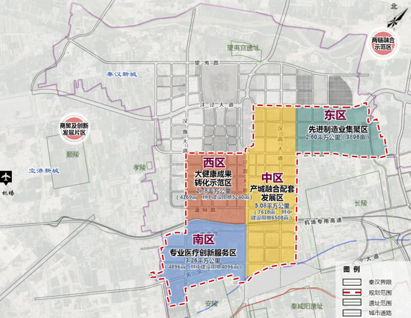 根据最新印发的《秦汉新城大健康产业链发展实施方案(2025-2027)》,大健康先进制造产业片区将以“一园四区+拓展区”总体规划协同发展:围绕总规划面积13.72平方公里的西咸新区·秦汉大健康产业园,南区(专业医疗创新服务区)、西区(大健康成果转化示范区)、东区(先进制造业集聚区)、中区(产城融合配套发展区)和拓展区各骋所长、摆脱同质、协同推进,加快激活区域产业聚变效应。