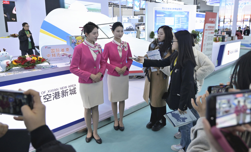 走进西安国际会展中心2号展馆开放平台展区,临空经济示范区和西咸空港综合保税区展区,临空经济特色吸引着来宾参观。