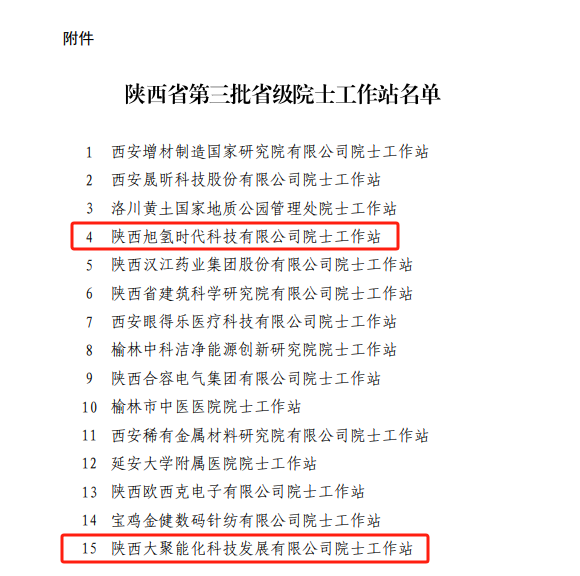 近日,省委人才办联合省科协公布了省级院士工作站认定名单,西咸新区2家入区企业陕西旭氢时代科技有限公司、陕西大聚能化科技发展有限公司成功入选。