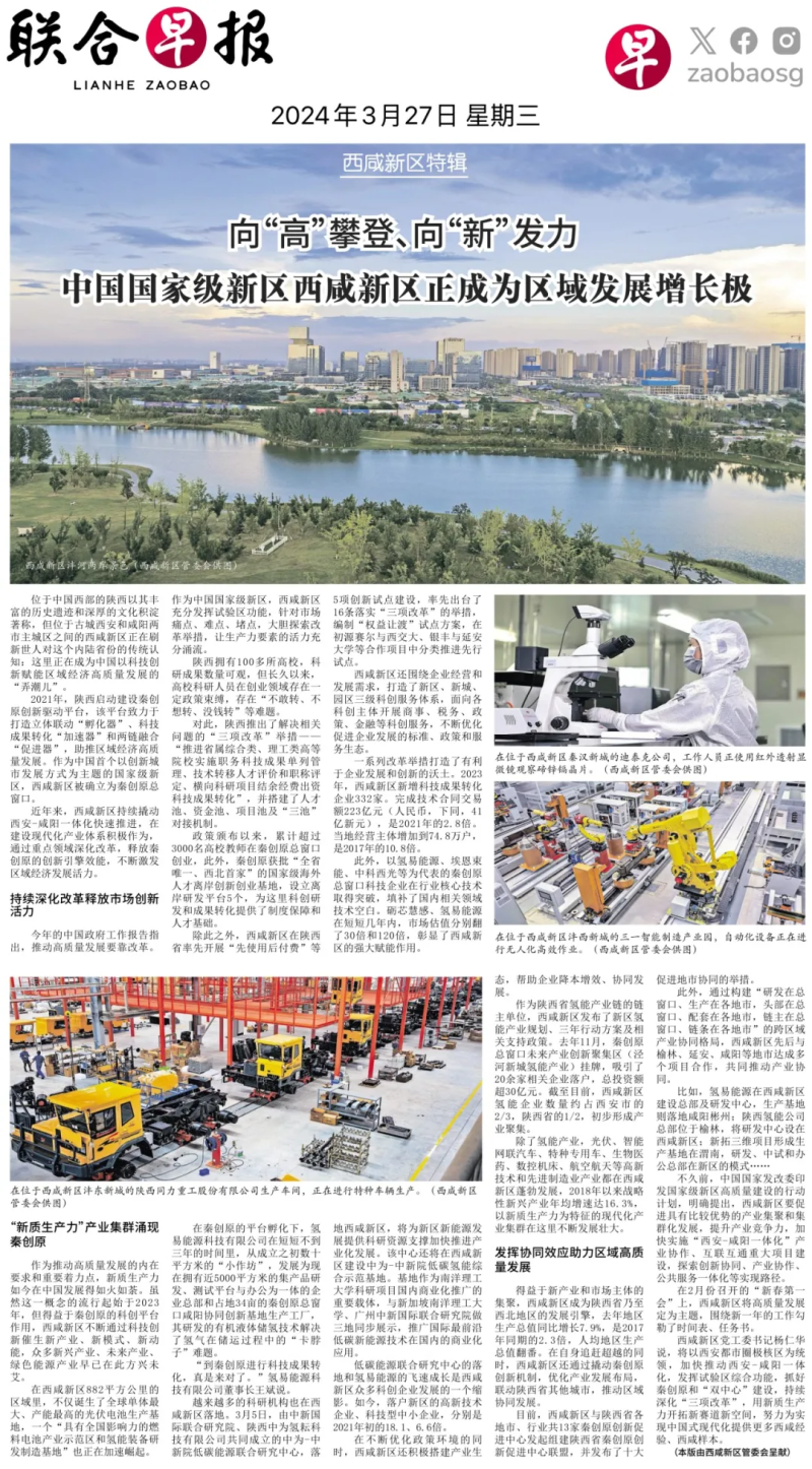 3月27日,新加坡《联合早报》以《向“高”攀登、向“新”发力——中国国家级新区西咸新区正成为区域发展增长极》为题,整版聚焦秦创原创新驱动平台及总窗口西咸新区建设成效。