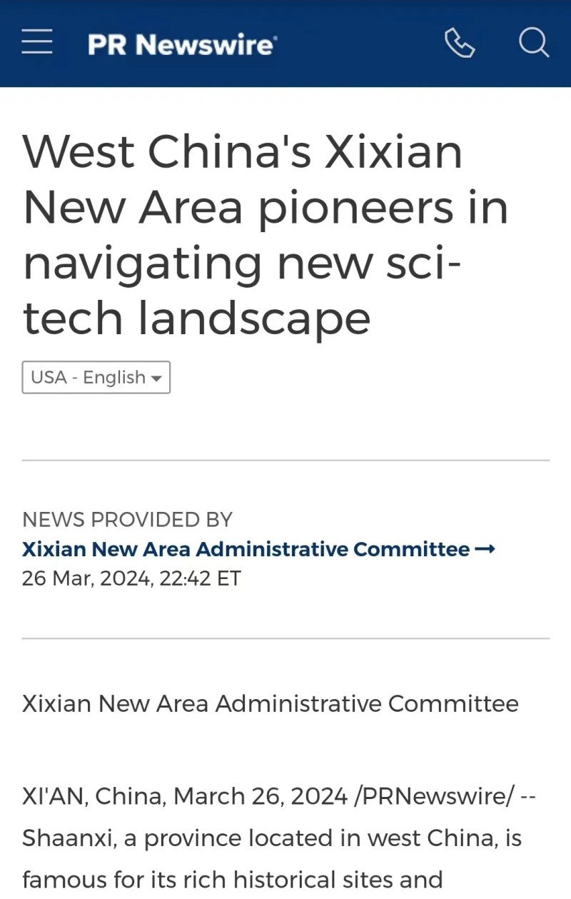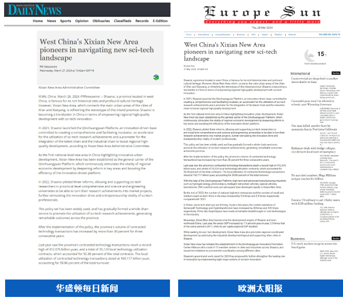 全球通讯社联盟发布文章《West China's Xixian New Area pioneers in navigating new sci-tech landscape》(中国国家级新区西咸新区竞逐科技创新“新蓝海”),被全球510家外媒转载,截至目前,总浏览量超3亿人次。