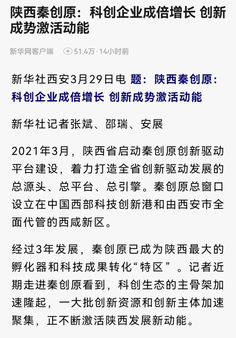 3月29日,新华社刊发电稿《陕西秦创原:科创企业成倍增长创新成势激活动能》,聚焦秦创原创新驱动平台建设成效,其中报道西咸新区持续深化“三项改革”,构建全领域、全链条、全要素科技创新体系推动新质生产力培育壮大,全文如下。