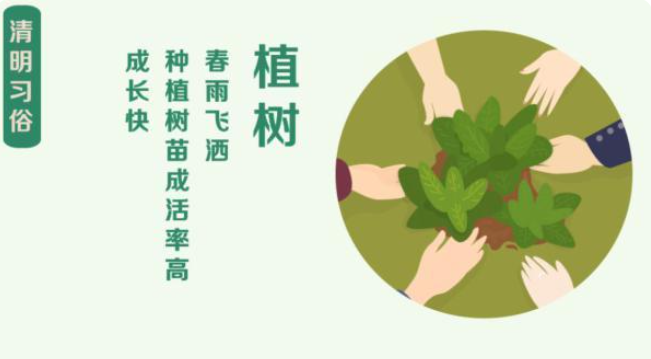 3.植树,清明前后,春阳照临,春雨飞洒,种植树苗成活率高,成长快。因此,自古以来,我国就有清明植树的习惯。有人还把清明节叫作“植树节”。植树风俗一直流传至今。1979年,人大常委会规定,每年三月十二日为我国植树节。这对动员全国各族人民积极开展绿化祖国活动,有着十分重要的意义。