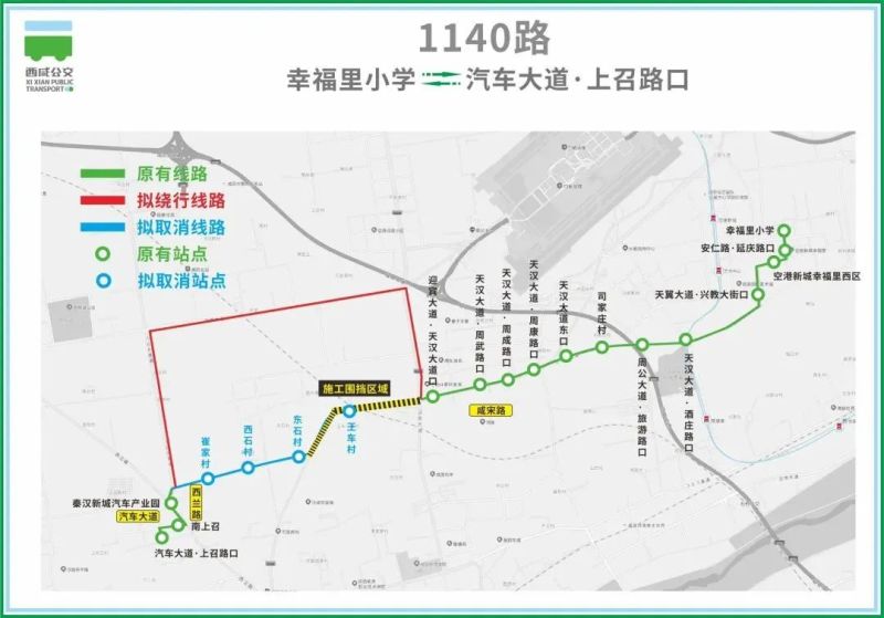 1050路、1140路自秦汉新城汽车产业园站点后绕行至咸北大道、北塬大道至迎宾大道,从王府井赛特奥莱西门恢复原线路。