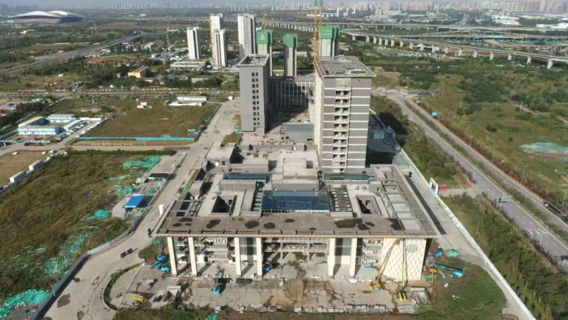 项目采用施工总承包管理模式,在施工过程中贯彻安全标准化、质量精细化、绿色环保化理念,引入智能监测系统、人员安全定位系统、人脸智能识别、智能水电管理等多项智能化技术,致力于打造智能建造示范项目。建成后将成为拥有 500张病床,突出中医特色的中西医结合综合性医院,承担区域内医疗、急救、康复及教学任务。