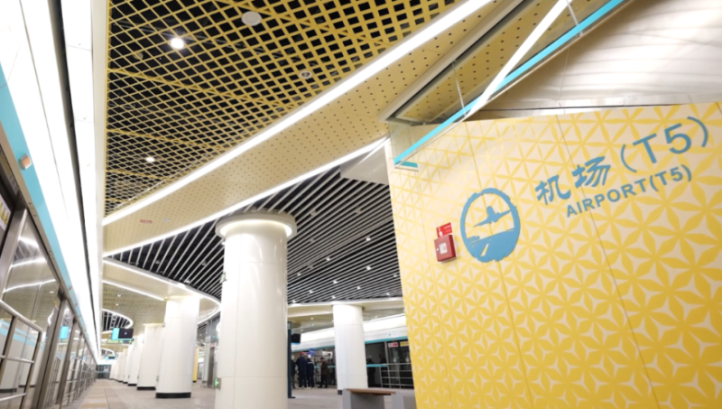 机场(T5)站位于西安咸阳国际机场T5航站楼东侧,机场过夜用房与停车楼之间,沿航站楼南北向与交通中心(GTC)正交布置,为两层岛式车站,总建筑面积16057.11平方米。车站站厅位于GTC首层换乘大厅内,站台位于地下一层。车站的建成投用,实现地铁与航空等多种交通方式的零距离换乘,有效提高市民群众和外地旅客的出行便捷程度。