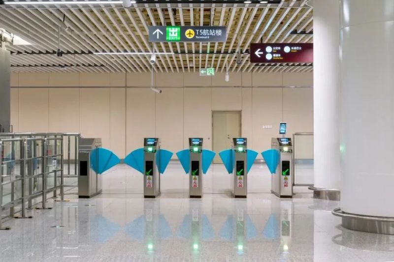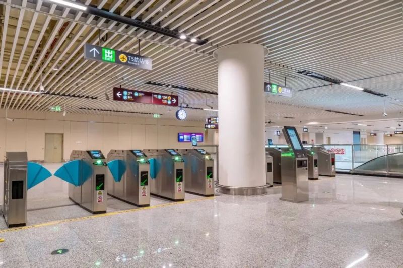 机场(T5)站进站支持单程票、本地及交通部一卡通、二维码、人脸识别乘车,满足乘客现金、二维码支付、数字人民币支付等多形式支付需求,特别是在机场(T5)站增设智能POS机设备,为持外卡刷卡乘客提供更加顺畅的支付体验;同时,出站闸机处增加乘客自助终端,能快速处理出站车票查询、补票扣费等票务业务,进一步为乘客出站提供便利。