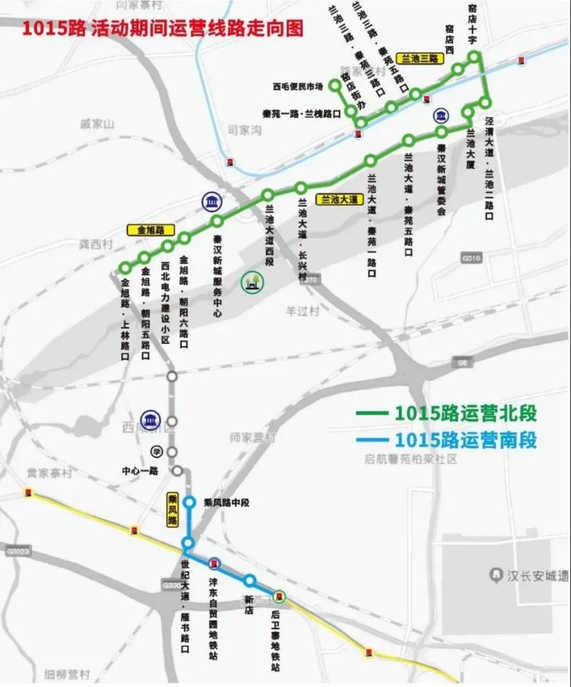 线路走向:1015路原由后卫寨地铁站至西毛便民市场,活动期间该线路实行两头运营,线路北段由金旭路·上林路口至西毛便民市场,线路南段由后卫寨地铁站至乘风路中段。