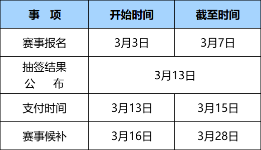 中签运动员须在2025年3月15日(星期六)22:00前支付报名费,否则视为自愿放弃参赛资格,该名额将在2025年3月16日(星期日)10:00后释放给候补序号靠前的运动员。