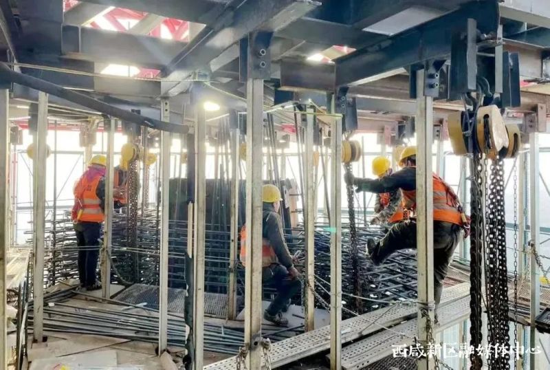 春光明媚,西咸新区沣东新城中国国际丝路中心项目建设现场机器轰鸣,工人们紧张作业,处处尽是生机勃勃的建设场景。