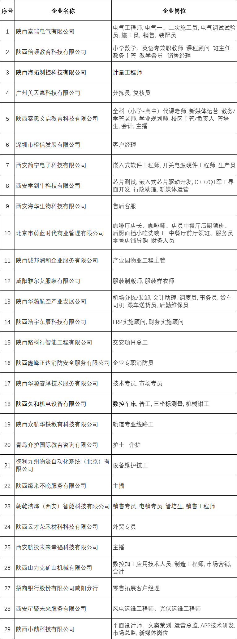 招聘企业及岗位名单