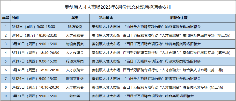 为全面落实全市八个方面重点工作任务,扎实做好稳就业、保就业、促就业,为企事业单位和广大求职者搭建双向选择平台,西咸新区人力资源服务中心将在八月份举办9场不同主题类型现场招聘会,具体安排如下。