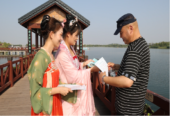 每逢节假日,景区各个点位都会有文明旅游志愿服务队伍为游客提供旅游咨询、路线引导等服务。身着汉服的导游人员、牛郎织女IP玩偶共同组成“汉文化文明旅游服务宣传队”,用古礼传递文明,增强游客的文明意识,热情向游客发放文明旅游宣传页,成为景区一道特别的风景。
