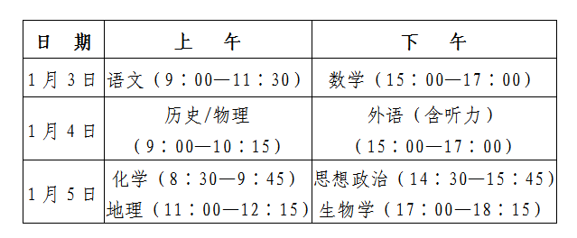 1.入场时间要记牢:①每科考试须至少提前一小时(首场语文和4日下午的外语科目考试提前一个半小时)到达考点,接受人脸识别和安检进入考点。②开考15分钟后不准进入考点(外语科目开考前15分钟不得入场)。每科目考试结束后统一离场,不得提前交卷出场。交卷出场后不得在考场附近逗留或交谈。③1月5日上午、下午连续参加两场考试的考生,可自由选择第一科考试结束后是否离开考点,选择不离开者须在考生候考区域等待;选择离开者再次进入考点、考场时,均须接受违规物品检查。