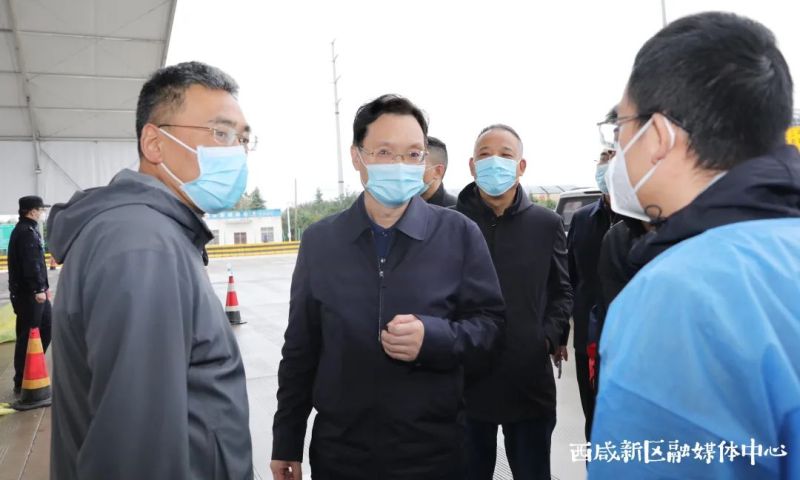 在沣东新城阿房宫收费站,姜建春调研检查疫情防控工作,仔细查看卡口车辆查验流程,详细询问人员配备、车辆通行、后勤保障、落地核酸检测以及外来人员车辆闭环管理等情况,并向奋战在防疫一线的工作人员表示慰问。